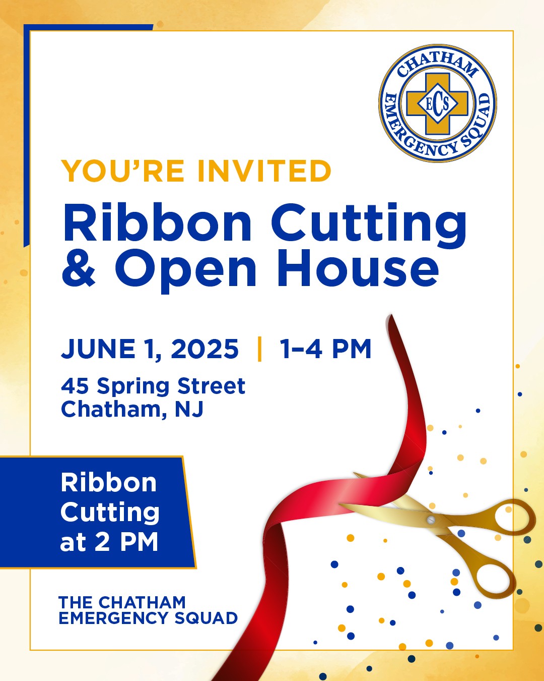 The Chatham Emergency Squad is excited to be hosting a ribbon cutting and open house at their newly renovated headquarters from 1pm to 4pm on Sunday, June 1st! In addition to the ribbon cutting at 2pm, and a Scoops Ice Cream Truck visiting from 2:15 – 3: 45pm, other activities will include ambulance and building tours, a meet and greet with the squad, CPR demonstrations, corn hole, and a slew of fun kid friendly activities! Please see the flier below for location information.